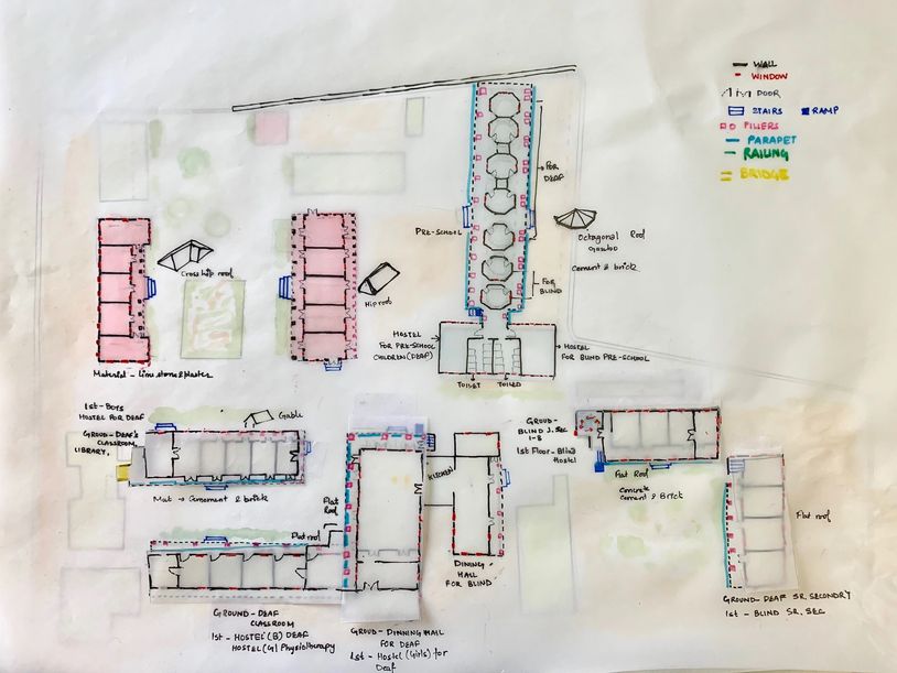 Studying building elements of the different areas within our space gave us insights into the design consideration made while designing a space for the differently-abled. Parapets and railings were used extensively in the blind school for their safety and navigation. In blind school, there is no window opening in the corridor to avoid any hazard for students passing by. Less obstruction makes it easy to navigate and differentiate. In pre-school, windows are smaller and at lower height to make them accessible to the small children.