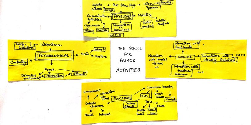 Activity is the most important parameter of all. The 3 schools have different methods of performing some kind of activities. The activity area is separated for the three schools as they possess different challenges. The method of teaching is different too, deaf students require visual inputs whereas visually impaired students require auditory inputs. Games differ accordingly and incorporate different sensual stimuli. In the case of visually impaired students, mobility is an activity in itself, especially in the case of pre-school children where they are yet to adapt to the new environment. They make their own games and activities when there are fewer stimuli from the environment as they seek more stimuli. In the case of the visually impaired, this behaviour is called blind mannerism. Customs and rituals are also different for the schools. Morning prayer is performed in sign language in the deaf and mute school whereas visually impaired children use all kinds of instruments to perform the same. By observing their activities and rituals, I learned a lot about their behaviour, likeness, problems and needs. Which helped me in the opportunity mapping.